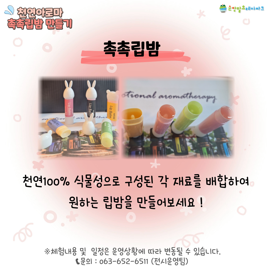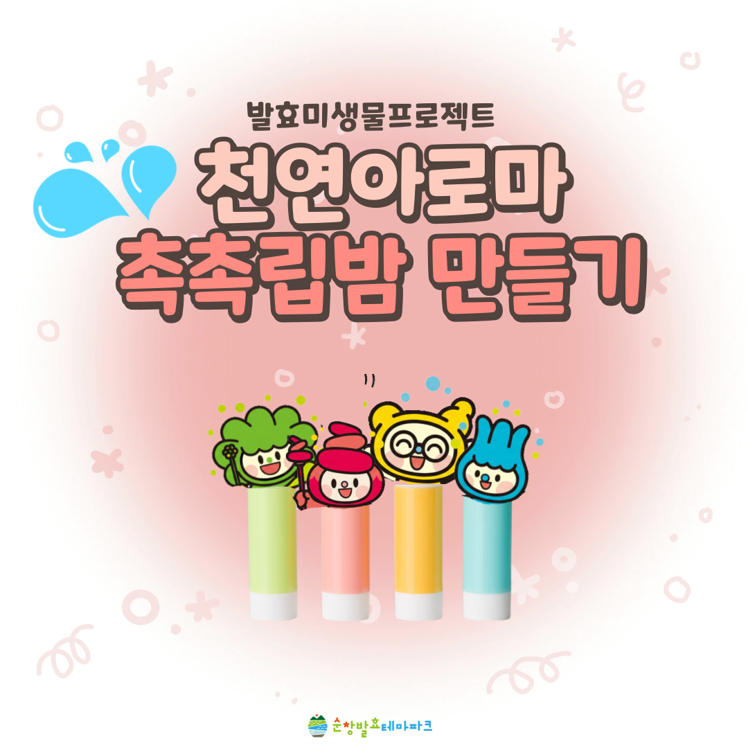 2025 발효미생물프로젝트 (천연아로마 촉촉립밤만들기) 행사기간2025년 10월 행사시간매주 일요일 접수기간체험 주 수요일 예약 이용대상전연령 참 가 비15,000원 네이버 예약신청 바로가기 본문 이전글2025 발효쿠킹클래스 (마카롱 만들기) 25.09.30 다음글2025 발효미생물프로젝트 (버물리밤만들기) 25.09.30 목록 댓글 0 댓글목록 등록된 댓글이 없습니다.