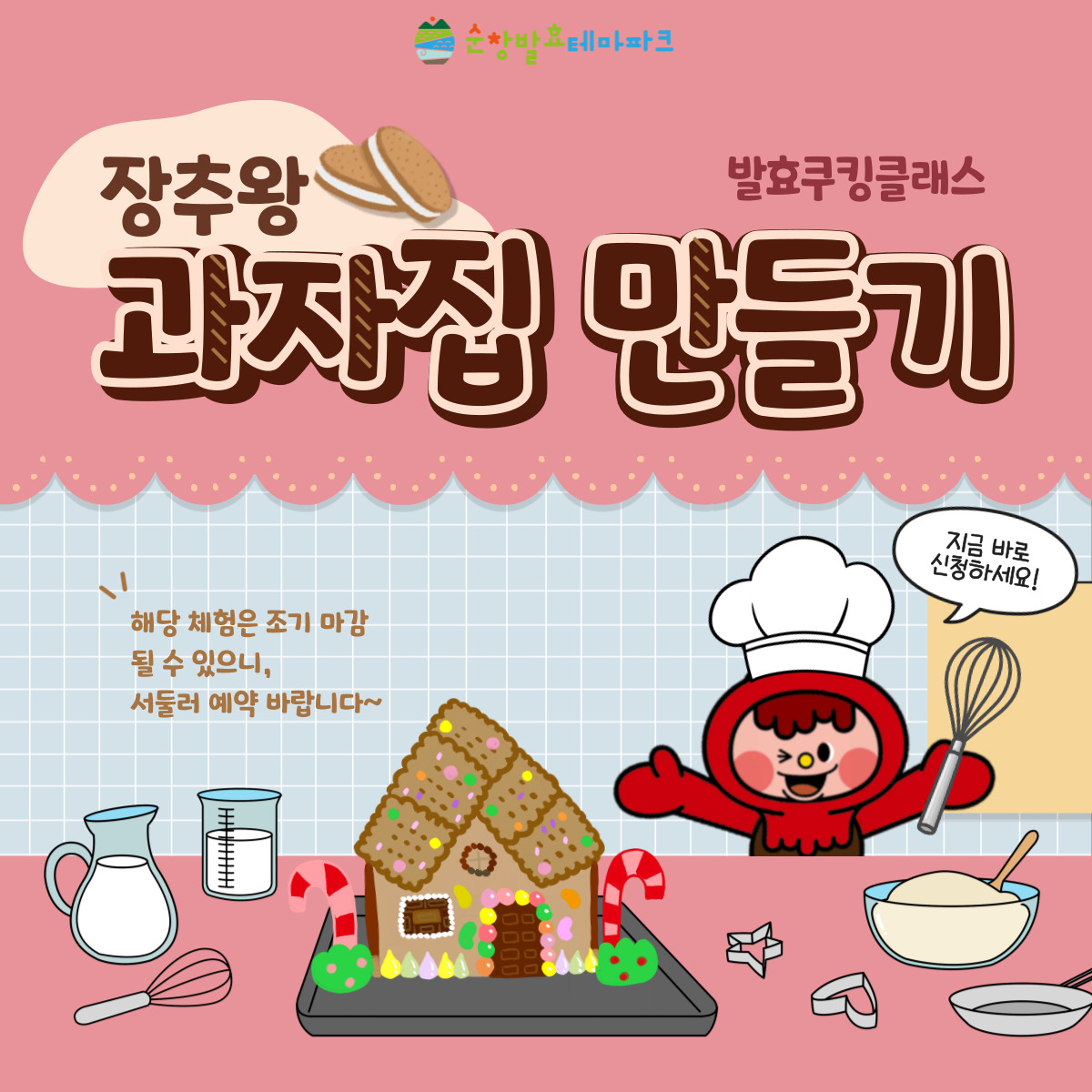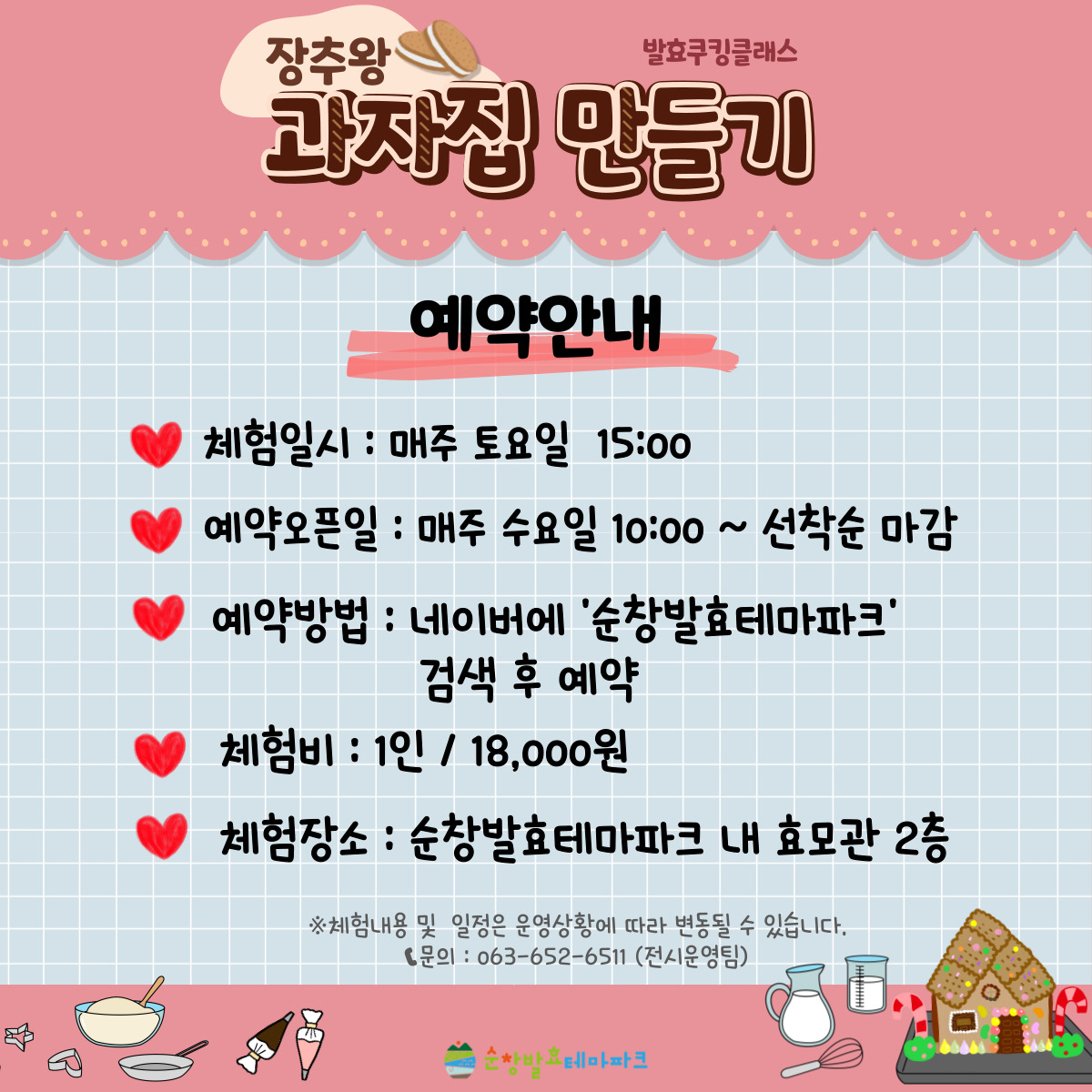 2025 발효쿠킹클래스 (장추왕 과자집만들기) 행사기간2025년 10월 행사시간매주 토요일 15:00 접수기간체험 주 수요일 예약 이용대상전연령 참 가 비18,000원 네이버 예약신청 바로가기 본문 이전글2025 발효미생물프로젝트 (고보습 아토피폼 바디로션 만들기) 25.10.02 다음글2025 발효쿠킹클래스 (마카롱 만들기) 25.09.30 목록 댓글 0 댓글목록 등록된 댓글이 없습니다.