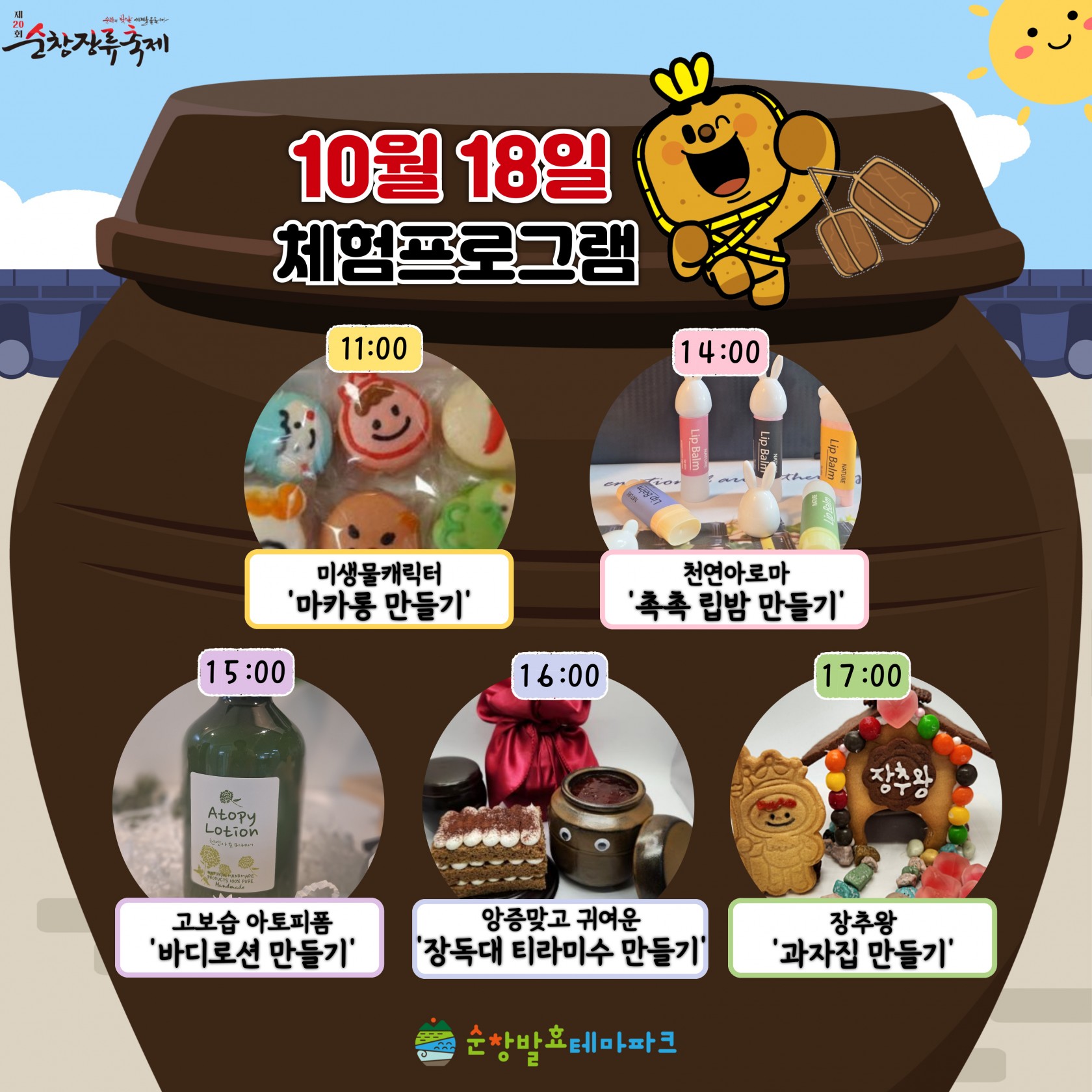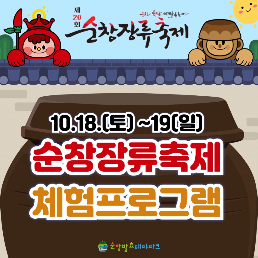 2025 순창장류축제 체험프로그램 행사기간2025년 10월 18일~19일 행사시간홈페이지 참조 접수기간10월 15일 10:00 이용대상전연령 참 가 비홈페이지 참조 네이버 예약신청 바로가기 본문 이전글2025 떡볶이페스타 체험프로그램 25.12.18 다음글2025 발효미생물프로젝트 (고보습 아토피폼 바디로션 만들기) 25.10.02 목록 댓글 0 댓글목록 등록된 댓글이 없습니다.
