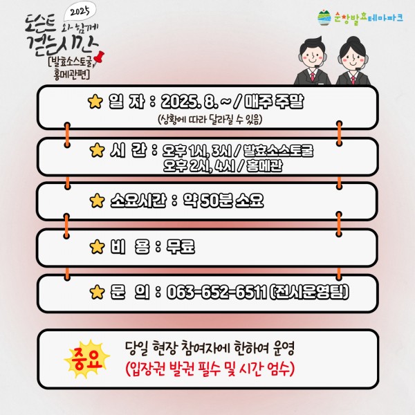 2025 도슨트와 함께 걷는시간 행사기간2025년 8월~ 행사시간오후 1시, 3시 ( 발효소스토굴) 오후 2시, 4시 / 홍메관 이용대상누구나 본문 이전글순창 KOREA 떡볶이 페스타 25.08.13 다음글2025 꼼순락 EVENT 25.08.13 목록 댓글 0 댓글목록 등록된 댓글이 없습니다.