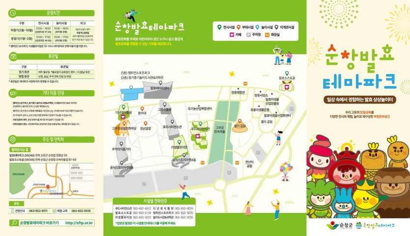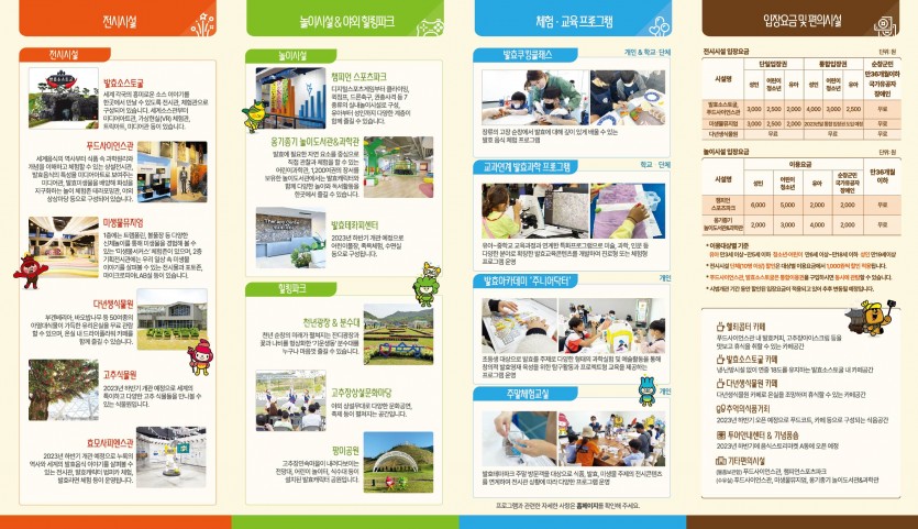 시설안내 종합안내도 캐릭터 소개 전시시설 발효소스토굴홍메관팡이관효모관다년생식물원햇살라운지 놀이시설 콩이관 1층콩이관 2층고고관 야외시설 천년광장팡이공원 편의시설 F&B기타편의시설기념품샵 이용정보 입장요금 운영시간 이용유의사항 오시는길 교육행사 행사·이벤트 교육프로그램 알림마당 공지사항 자료실 사진자료홍보자료 자주묻는질문 예약 개인예약 단체예약 신청내역확인
